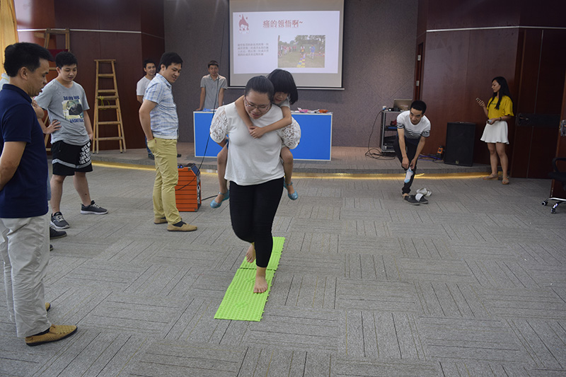 紅組首先選擇了背著隊(duì)員走過指壓板