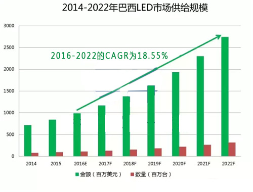 ? 得益于巴西政府和地方政府對(duì)LED照明產(chǎn)品的推廣,據(jù)TechSci Research統(tǒng)計(jì),2016年巴西LED市場(chǎng)需求規(guī)模為8.48億美元,預(yù)計(jì)2022年將增長(zhǎng)至25.62億美元,實(shí)現(xiàn)20.25%的年復(fù)合增長(zhǎng)率。