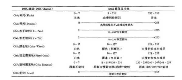 1.DMX512協(xié)議的基本作用機(jī)理 ?一個(gè)DMX接口多可以控制5l2個(gè)通道,因?yàn)殡娔X燈一般都有幾個(gè)到幾十個(gè)功能,所以。一臺電腦燈需占用少則幾個(gè)、多則幾十個(gè)控制通道。下面通過一個(gè)功能簡單,通道較少的小型電腦燈的DMX通道表,看一下DMx5l2的控制過程與原理。 ?該電腦燈有八個(gè)DMX控制通道,一個(gè)顏色輪,兩個(gè)圖案輪,具有調(diào)光、頻閃、搖頭及變換光線顏色、圖案等功能,其DMX通道序號、通道編碼和對應(yīng)功能如表2所示。