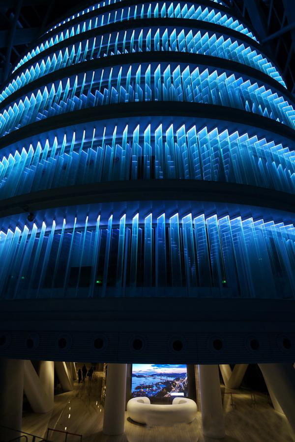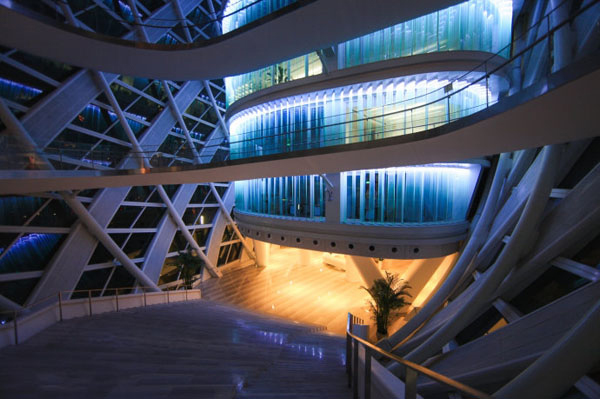 鳳凰國際傳媒中心建筑結構特殊,充滿創(chuàng)意,是用一個具有生態(tài)功能的外殼將具有獨立維護使用的空間包裹在里面,體現(xiàn)了樓中樓的概念。兩者之間有許多共享公共空間,公共空間有臺階、景觀平臺、空中環(huán)廊和自動扶梯,使得整個建筑充滿動感和活力。
